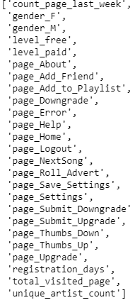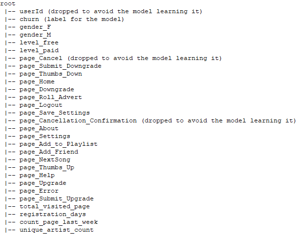 Il nostro obiettivo era prevedere se un utente si annullerà dal servizio per consentire all'azienda di fargli offerte o sconti per cercare di mantenere questi utenti. Dopo aver ripulito i dati e averli modellati in un set di dati pronto per essere utilizzato per l'addestramento ML, abbiamo testato le prestazioni di tre diversi modelli. Tutti i modelli risultanti hanno avuto successo nel prevedere se un utente lascerà il servizio o non molto meglio di un Naive Predictor che fornisce sempre la risposta "0" (gli utenti non rinunceranno). Considerando il F-1 Score, il modello migliore è la Logistic Regression. Nonostante i buoni risultati, il modello potrebbe essere migliorato creando funzionalità più ingegnerizzate per catturare alcuni modelli di comportamento che potrebbero essere correlati alla soddisfazione dell'utente del servizio: il motore di raccomandazione è buono? Significa che la canzone consigliata agli utenti incontra davvero i loro gusti. Dall'importanza delle funzionalità di GBT, le funzionalità grezze page_Thumbs_Up e page_Thumbs_Down sono piuttosto importanti, quindi una nuova funzionalità che cattura i gusti musicali degli utenti può davvero migliorare il modello