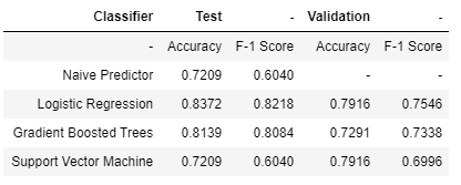 Complessivamente la Logistic Regression ha i migliori risultati con un F-1 Score di 0,8218 sul set di dati di test e 0,7546 sul set di dati di convalida